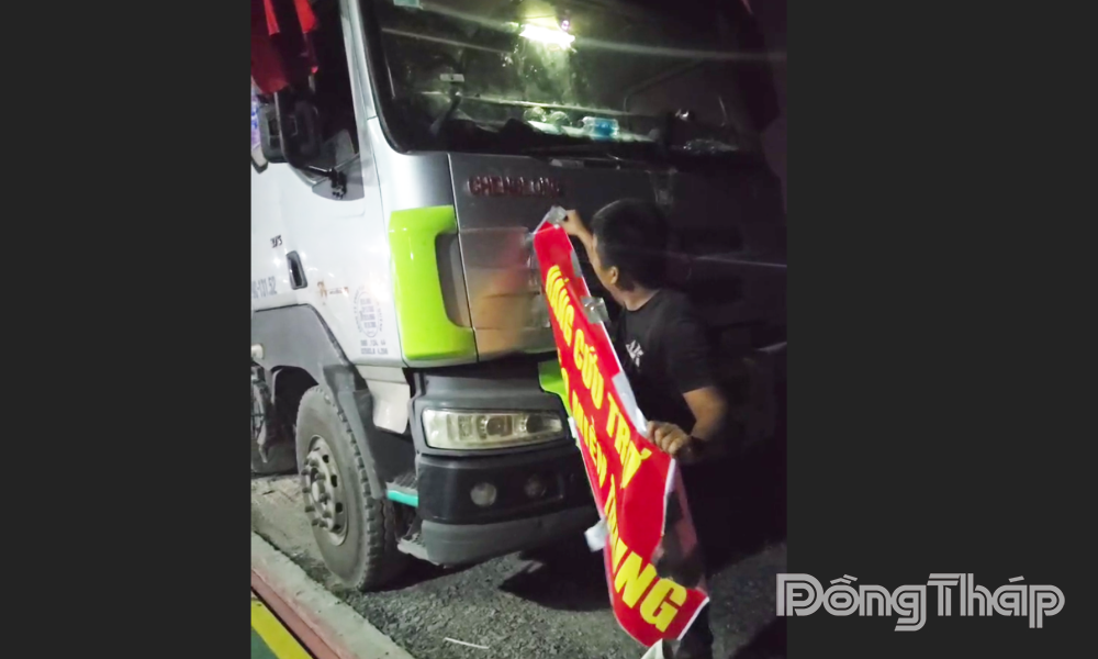 Còn đối với hai lá cờ Tổ quốc và băng rôn, tài xế trình bày trong quá trình chờ nhận hàng tại kho gạo Minh Triết tọa lạc xã Lấp Vò, tỉnh Đồng Tháp, có 1 người đàn ông tự xưng quen với chủ xe và mang lại dán, gắn lên xe.