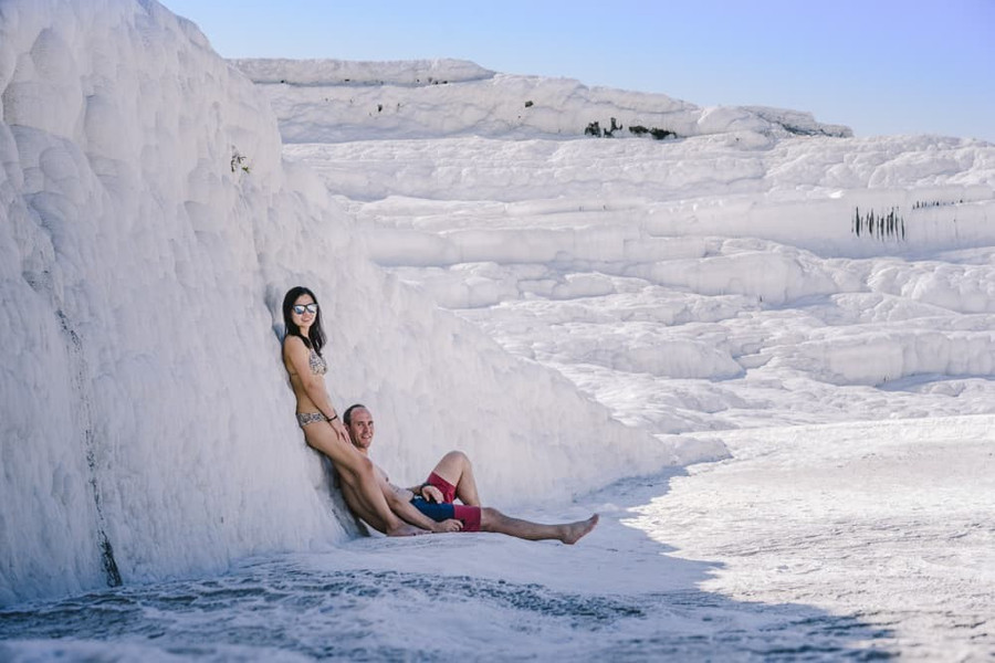 Toàn cảnh Pamukkale hệt như ngọn đồi ruộng bậc thang trắng. Trong cái nắng chan hòa, nó sáng lung linh. Mỗi bậc thang lại có một hoặc vài hồ nước nông, nước trong xanh như ngọc lam. Dẫu là giữa những tháng mùa Hè nhiệt độ lên đến 37 độ C, nó vẫn trắng tinh khôi, quanh năm suốt tháng nườm nượp du khách.