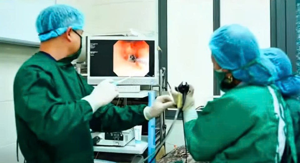 Các bác sĩ nội soi gắp dị vật trong đường thở của bệnh nhân/Ảnh BV