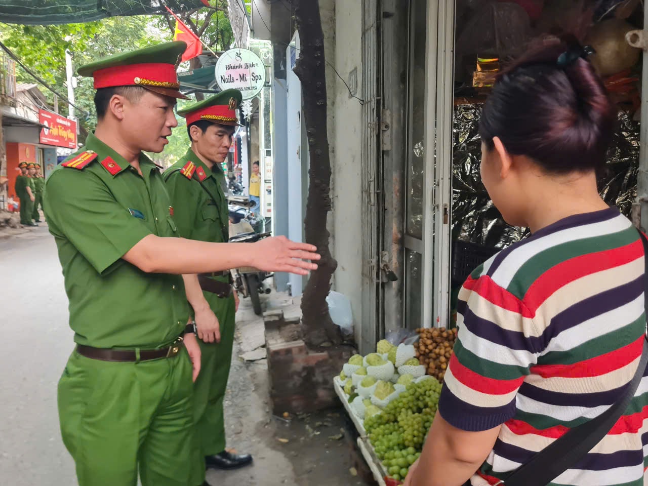 Công an phường Xuân Đỉnh nhắc nhở tiểu thương đảm bảo trật tự đô thị tại ngõ 126 Xuân Đỉnh. Ảnh: PV