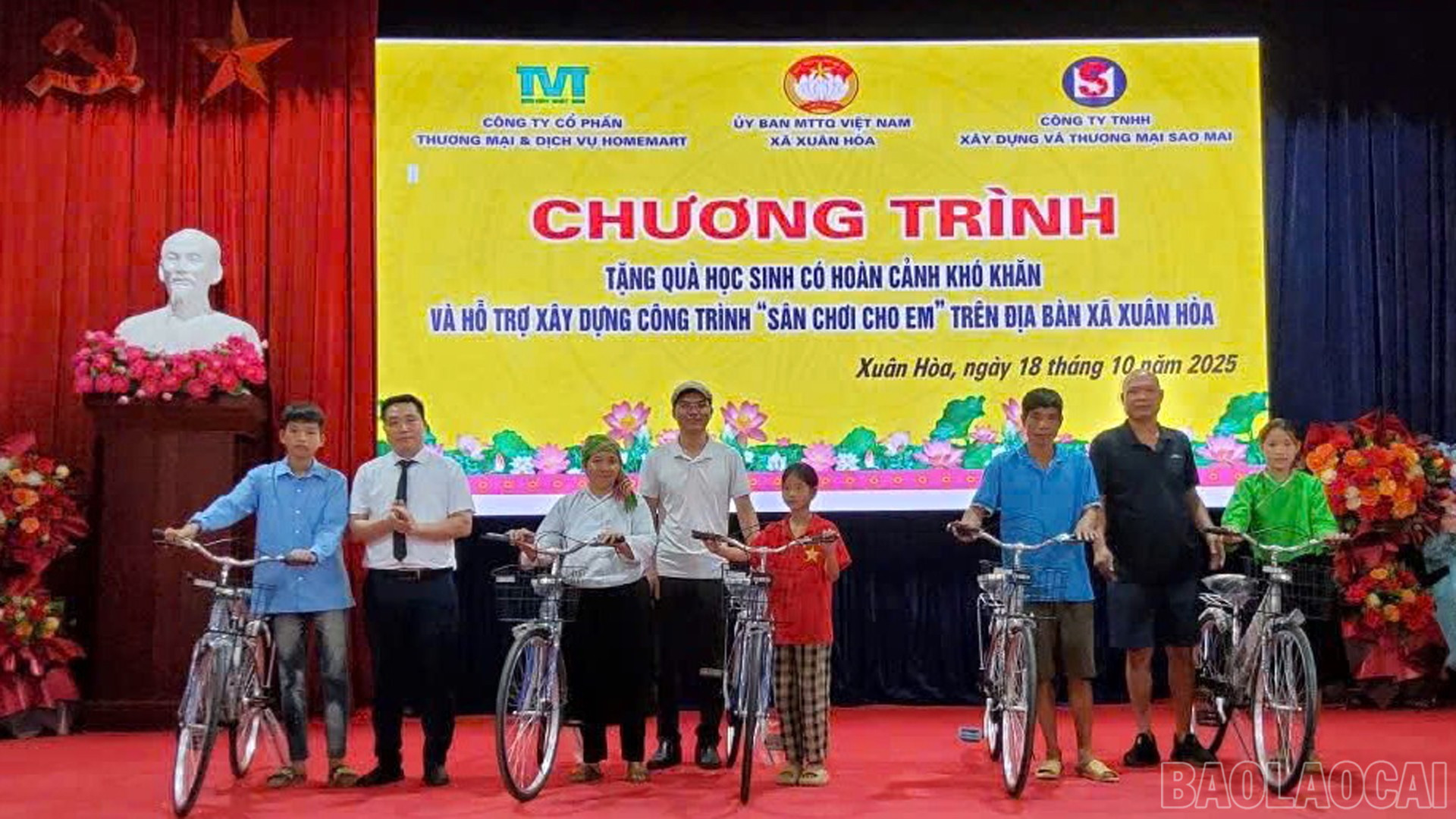 Trước đó, ngày 18/10, Ủy ban MTTQ Việt Nam xã Xuân Hòa cũng tổ chức trao tặng 5 chiếc xe đạp, tổng trị giá hơn 8 triệu đồng cho 5 em học sinh có hoàn cảnh khó khăn trên địa bàn xã Xuân Hòa; trao hỗ trợ xây dựng công trình “Sân chơi cho em” cho Trường Mầm non số 1 Xuân Hòa, trị giá 25 triệu đồng từ nguồn hỗ trợ của Công ty TNHH Xây dựng và Thương Mại Sao Mai (Thái Nguyên) và Công ty Cổ phần Thương mại và Dịch vụ Homemart (Hà Nội).