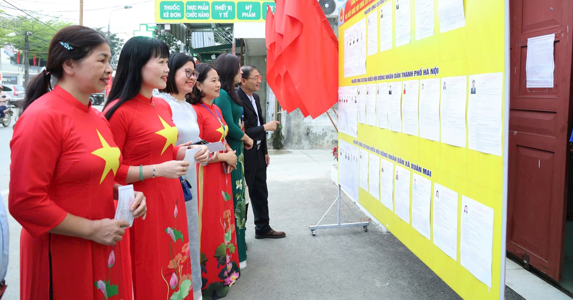 Khu vực bỏ phiếu tại xã Xuân Mai được trang trí trang trọng với Quốc kỳ, băng rôn, khẩu hiệu chào mừng ngày bầu cử.