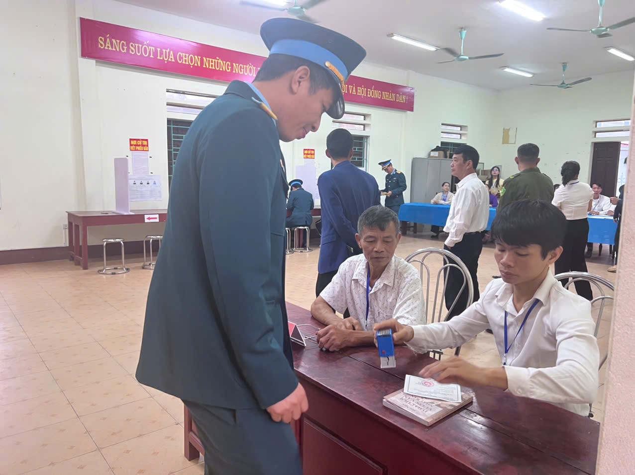 Thành viên tổ bầu cử hướng dẫn cử tri thực hiện các bước bỏ phiếu.