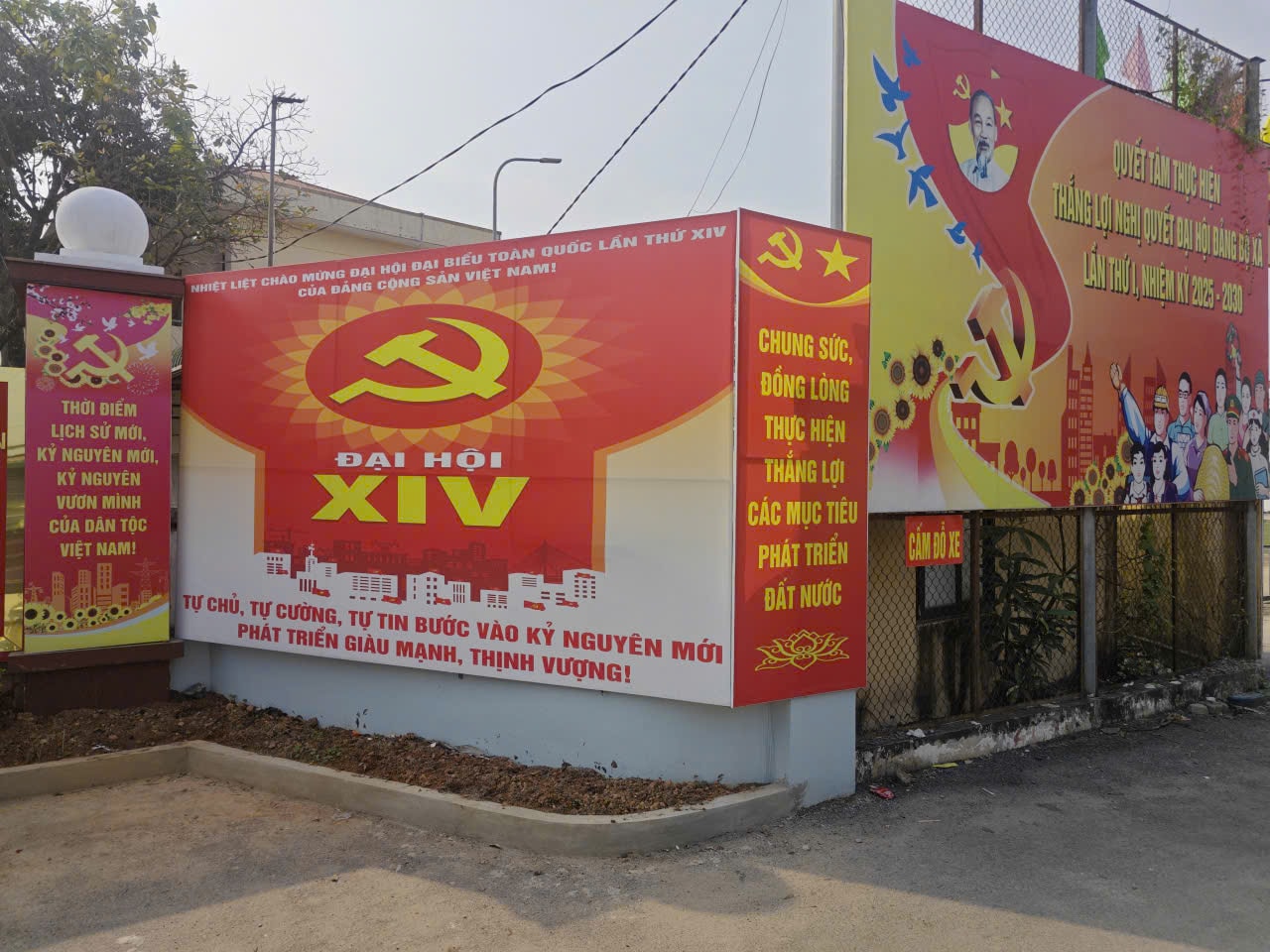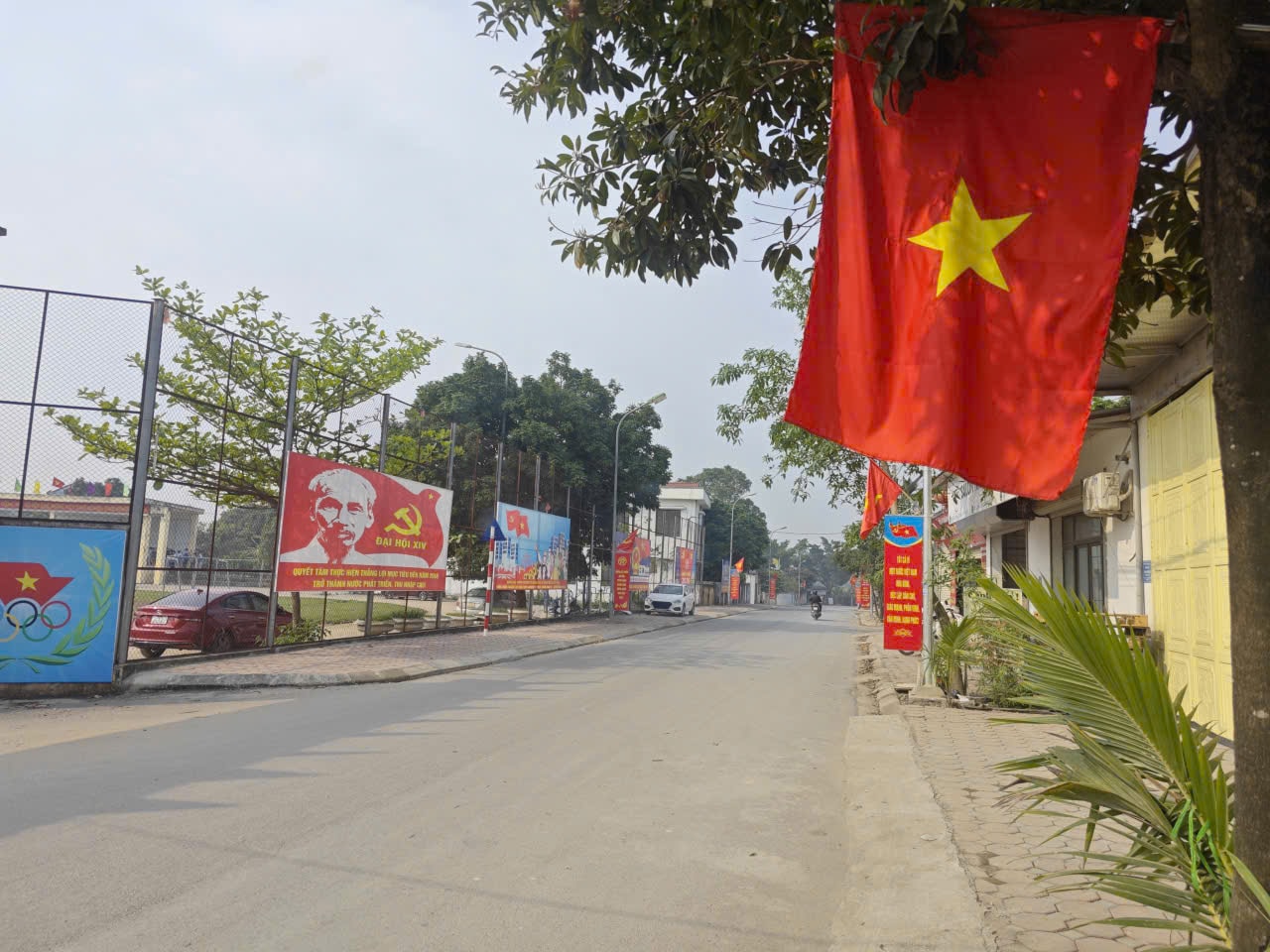 Tuyến đường trung tâm xã Xuân Mai rực rỡ cờ Tổ quốc và pano tuyên truyền, tạo không khí phấn khởi hướng về ngày bầu cử đại biểu Quốc hội khóa XVI và đại biểu HĐND các cấp. Ảnh: PV