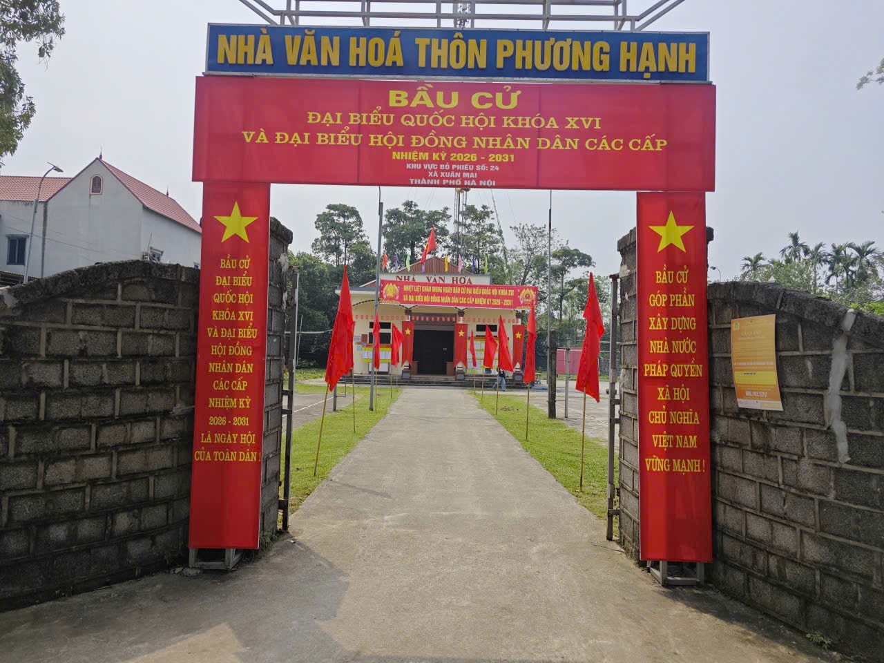 Khu vực bỏ phiếu tại Nhà Văn hóa thôn Phương Hạnh được trang hoàng rực rỡ. Ảnh: PV