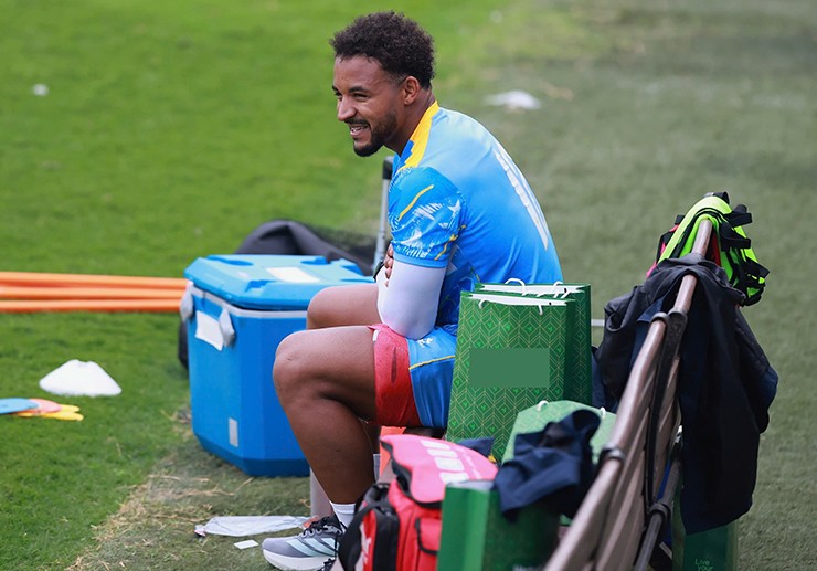 Xuân Son ngồi xem đồng đội tập luyện với cái đùi trái được băng bó.