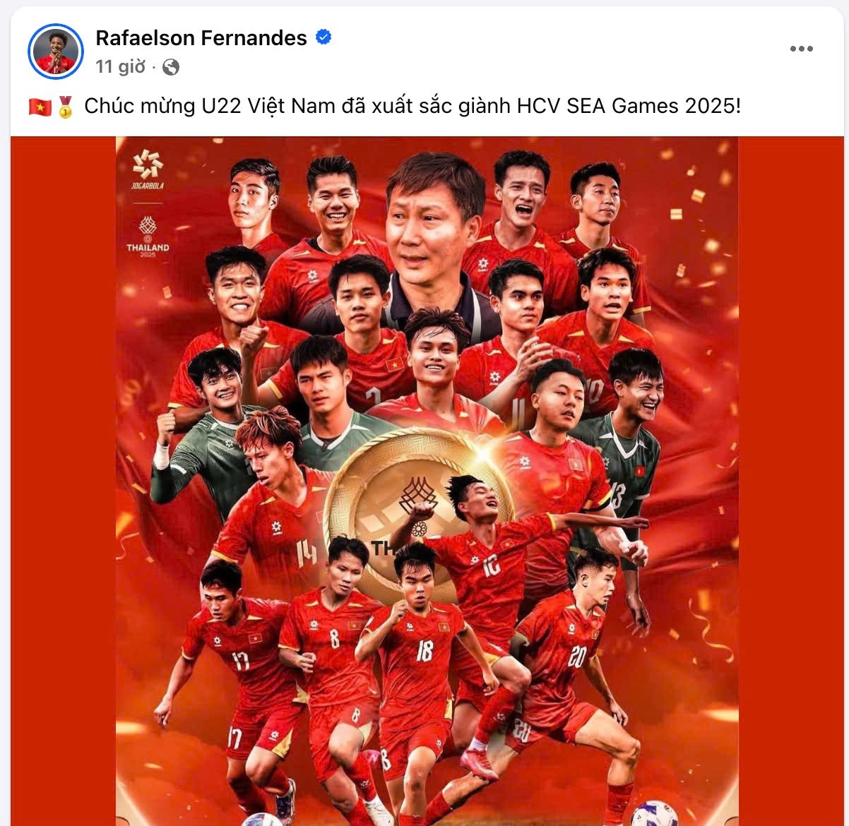 Tương tự, trung vệ Quế Ngọc Hải cũng dành nhiều lời khen cho U22 Việt Nam: “Chúc mừng hành trình giành HCV SEA Games tuyệt vời của đội U22 Việt Nam. Chúc mừng các cầu thủ trẻ vì một trận chung kết đầy cảm xúc, với chiến thắng được tạo nên từ tinh thần chiến đấu không bỏ cuộc”.
