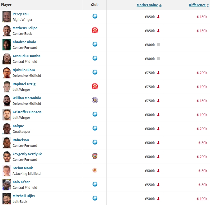 Nếu tính ở sân chơi V-League 2025/2026, nhiều cầu thủ ngoại binh của các đội bóng cũng tụt giá. Percy Tau (Nam Định) hay Matheus Felipe (Công an TP.HCM) trước khi đến V-League có giá 1 triệu euro đã giảm xuống còn 850.000 euro. Về trường hợp của Njabulo Blom bên phía Nam Định, cầu thủ này do dính chấn thương không thi đấu nên chỉ còn giá 750.000 euro, tụt 200.000 euro trước khi đến Việt Nam.