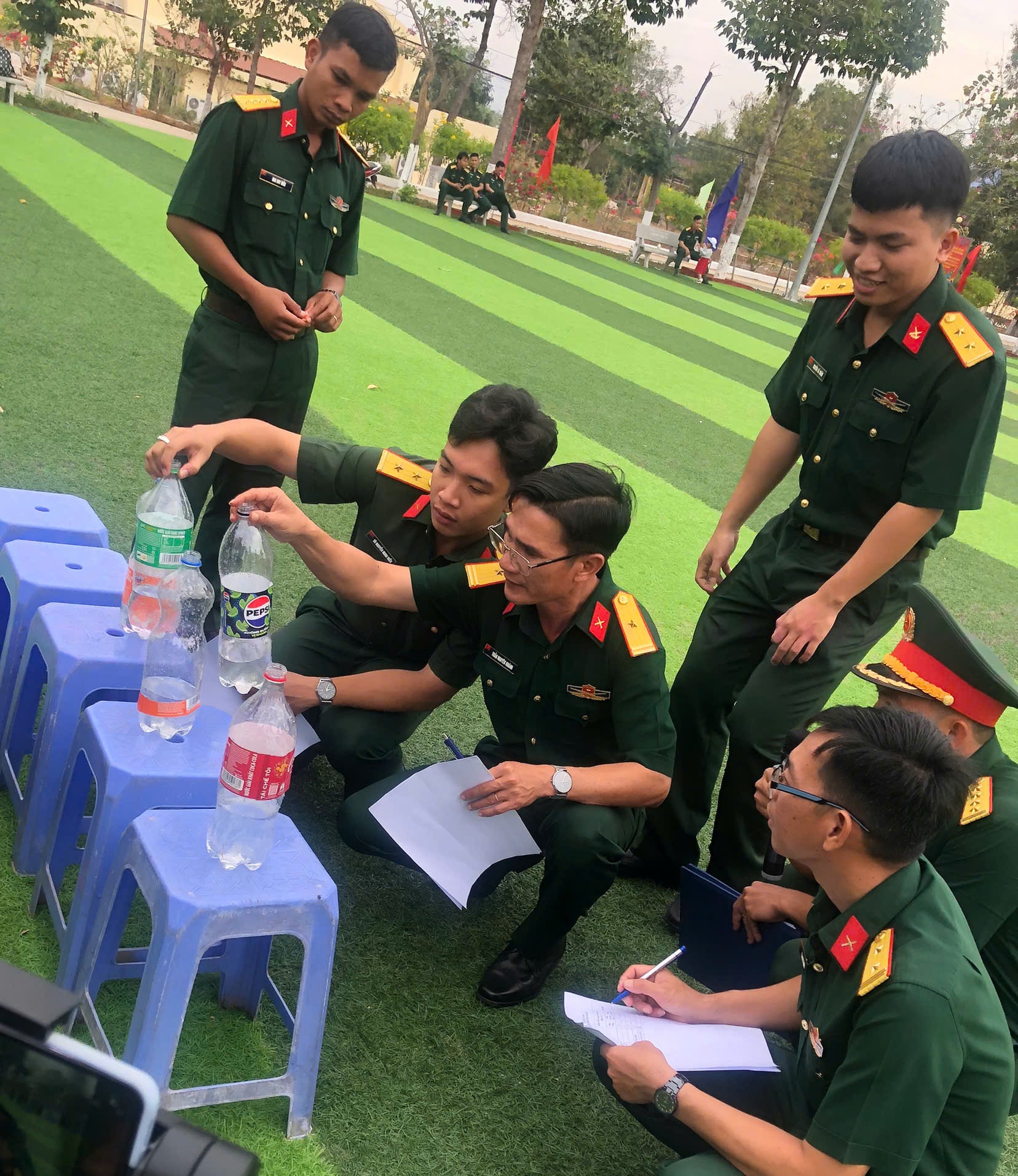 Các chiến sĩ và đoàn viên thi múc nước bằng tay