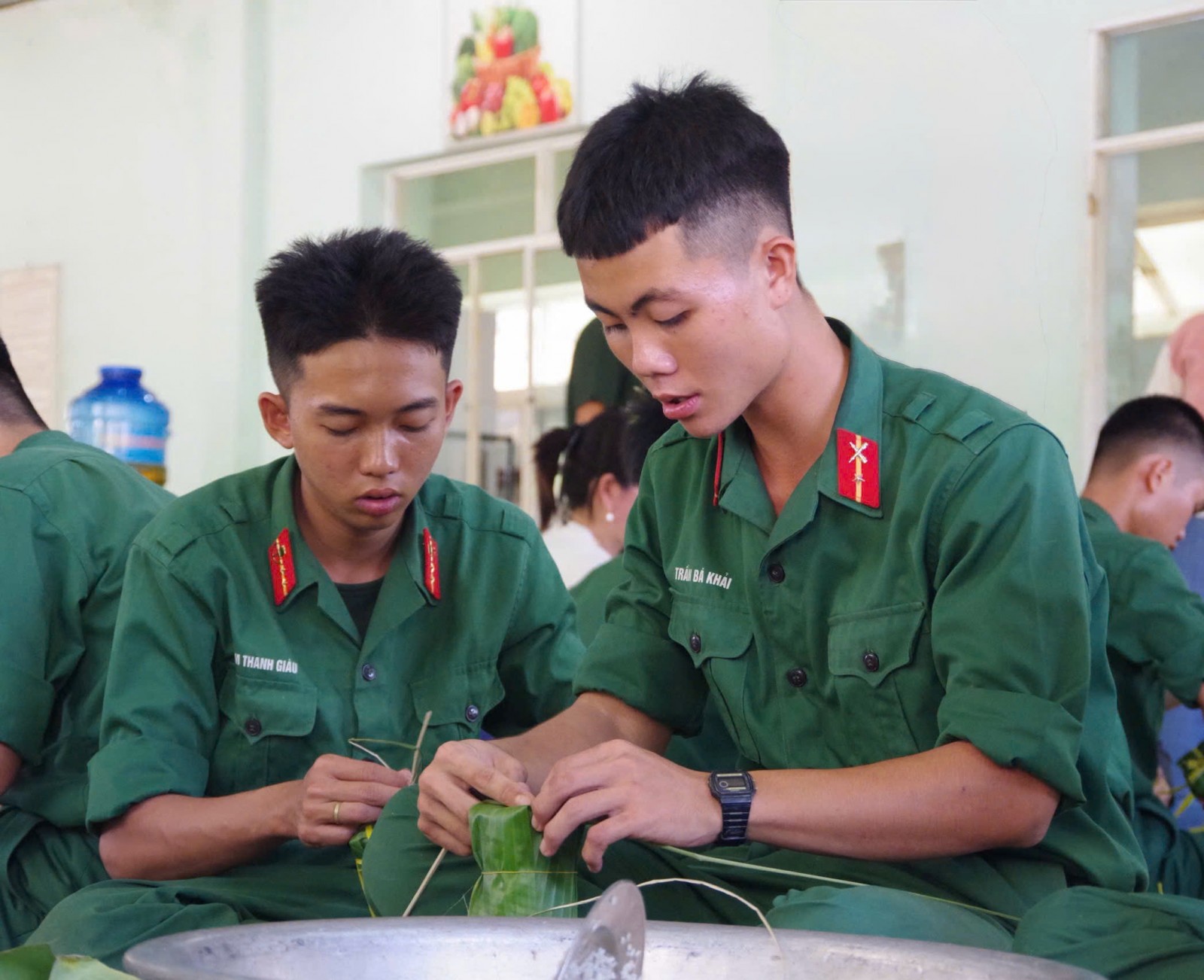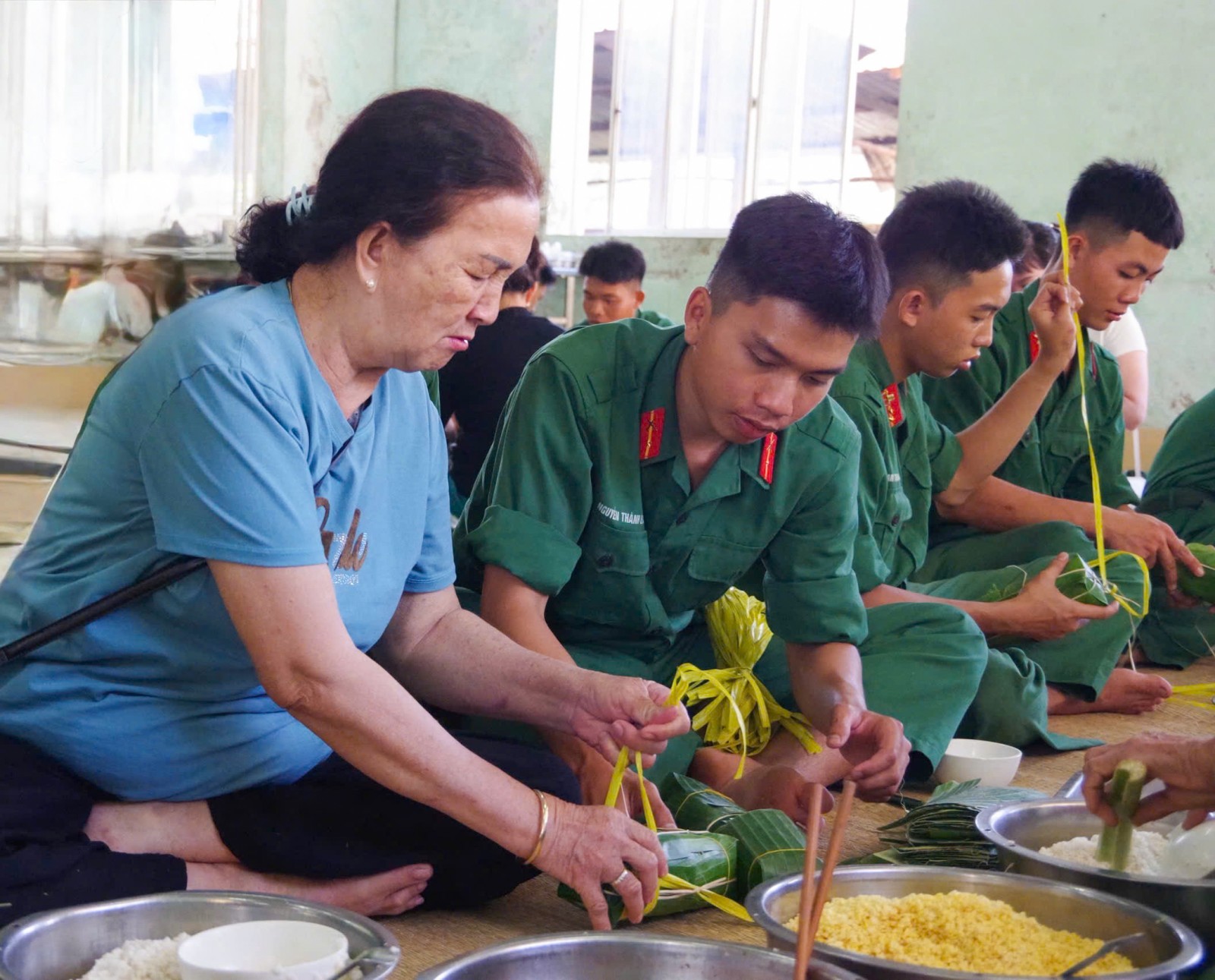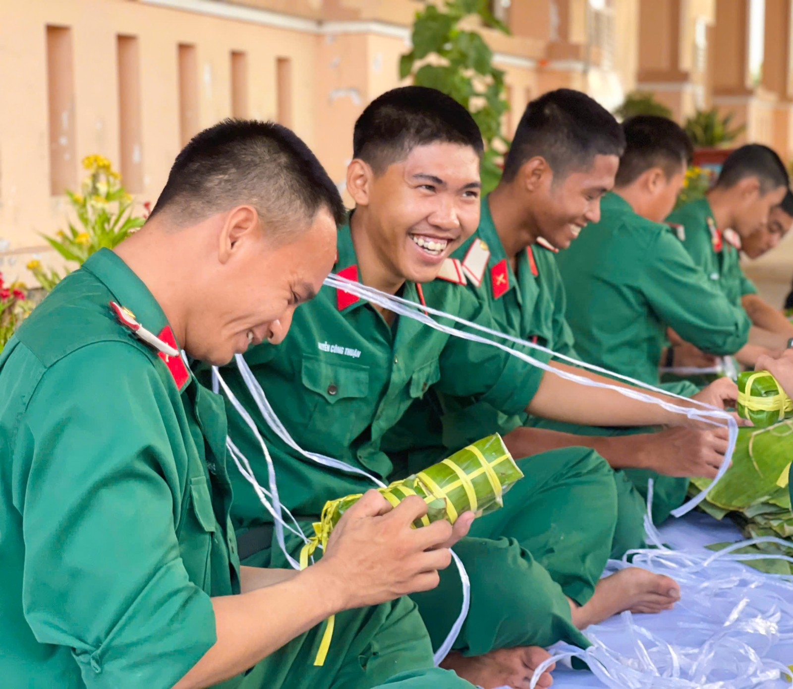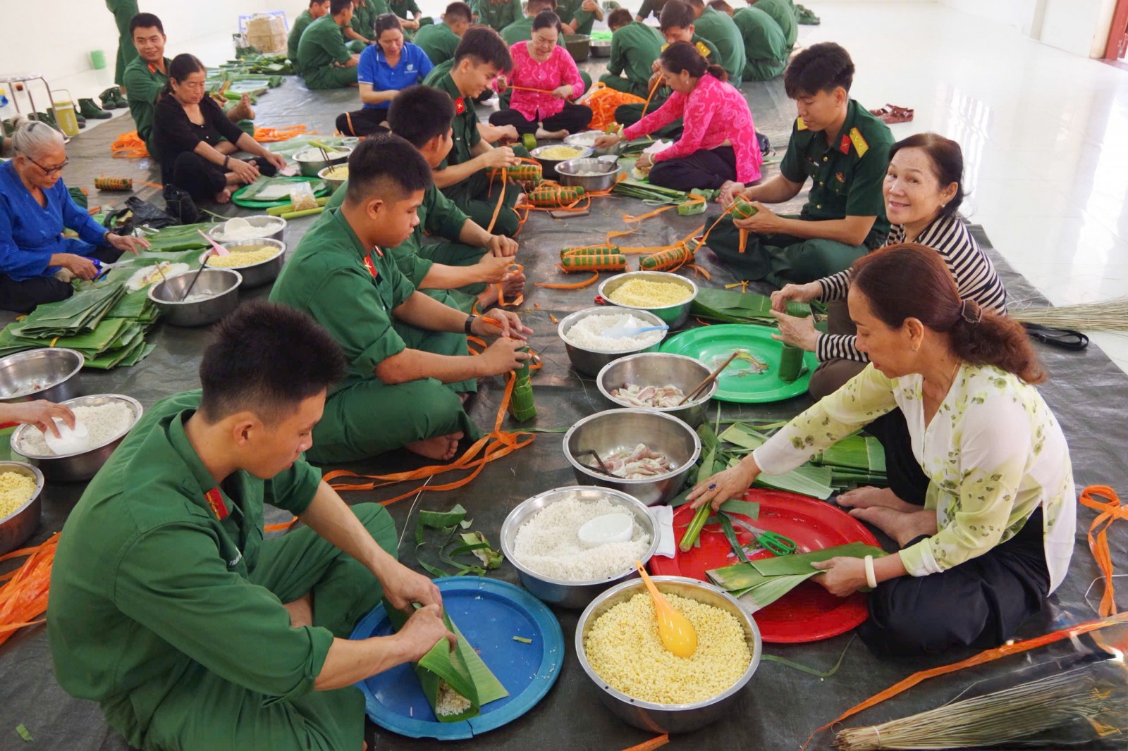 Tại Đại đội 6, Tiểu đoàn 519, Trung đoàn 893 (Bộ Chỉ huy Quân sự tỉnh An Giang), cán bộ, chiến sĩ cùng phụ nữ xã Giang Thành (tỉnh An Giang) tất bật chuẩn bị nguyên liệu ngay từ sáng sớm. Người rửa lá, người vo nếp, người chuẩn bị nhân… Mỗi người một việc nhưng ai cũng chung niềm háo hức. Tiếng cười xen lẫn khói bếp làm ấm cả khoảng sân đơn vị.