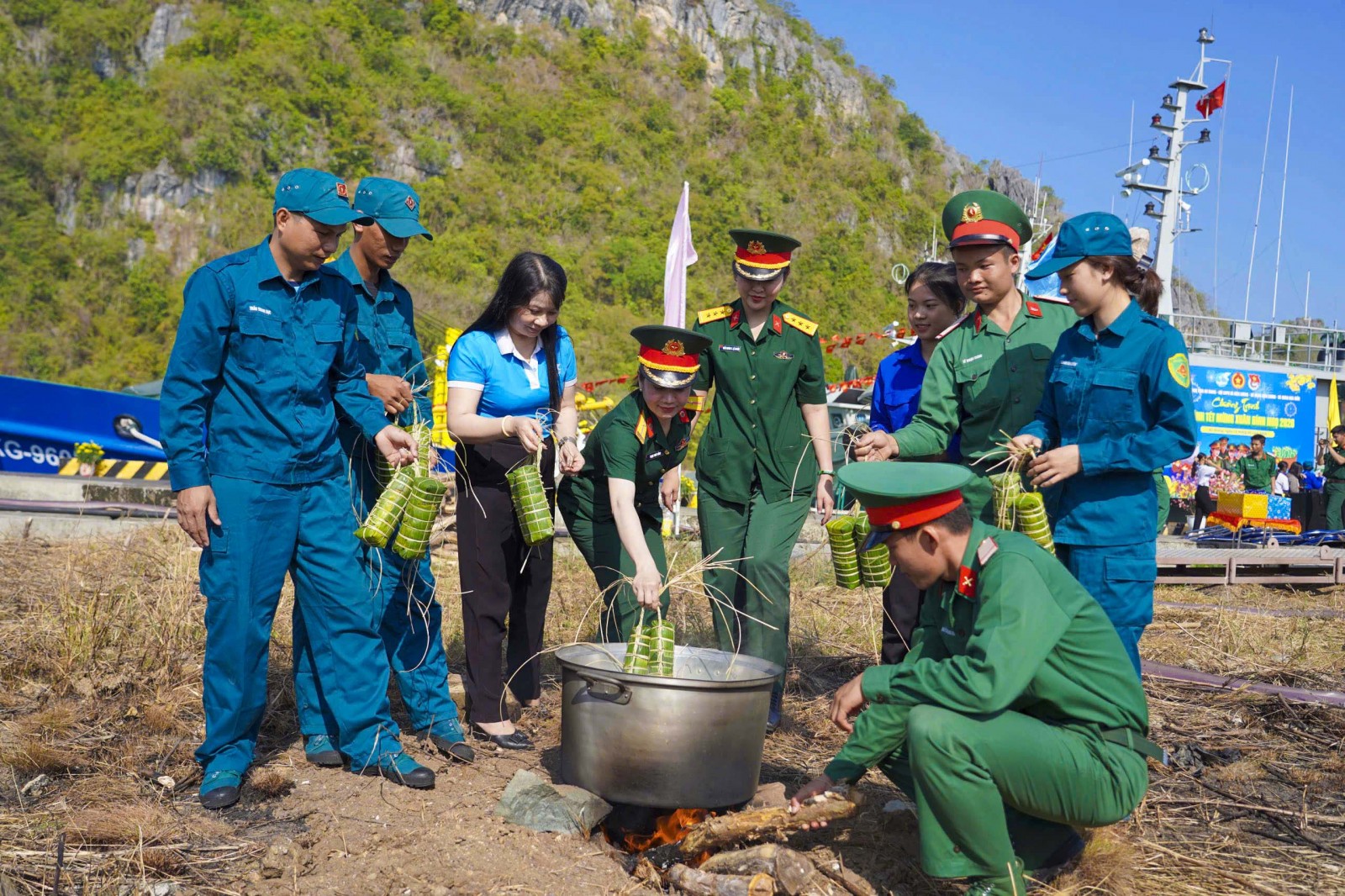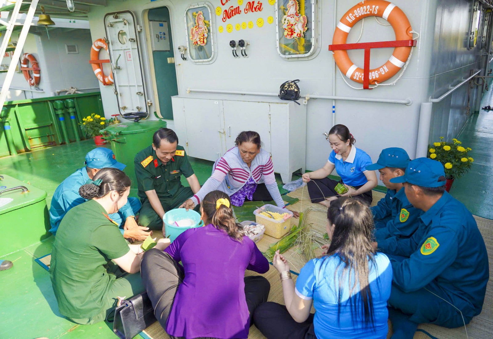 Trên những boong tàu ngày giáp tết, tiếng cười nói hòa cùng mùi thơm của nếp mới, đậu xanh, lá chuối. Từng đòn bánh được gói ghém cẩn thận, gửi gắm tình cảm của hậu phương đến những người lính đang làm nhiệm vụ.