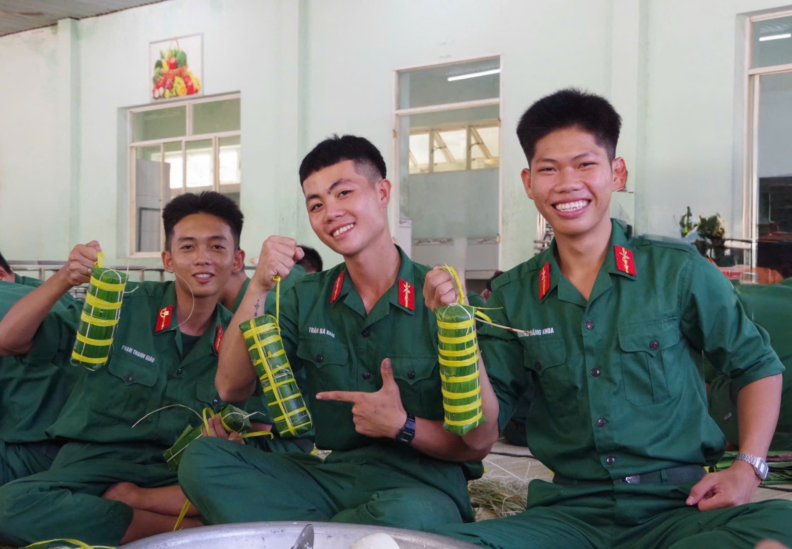 Nụ cười hồn nhiên của người chiến sĩ trẻ khi lần đầu tự tay buộc trọn đòn bánh tét, như giữ lại một chút tết quê nhà giữa doanh trại.