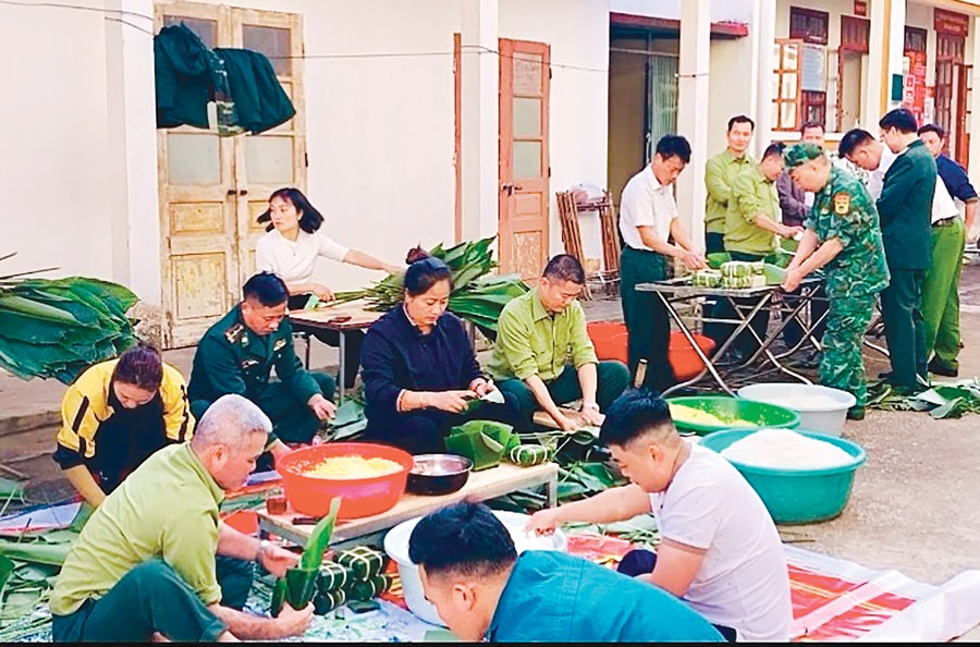 Cán bộ, chiến sĩ Đồn Biên phòng A Mú Sung cùng nhân dân gói bánh chưng đón Tết.