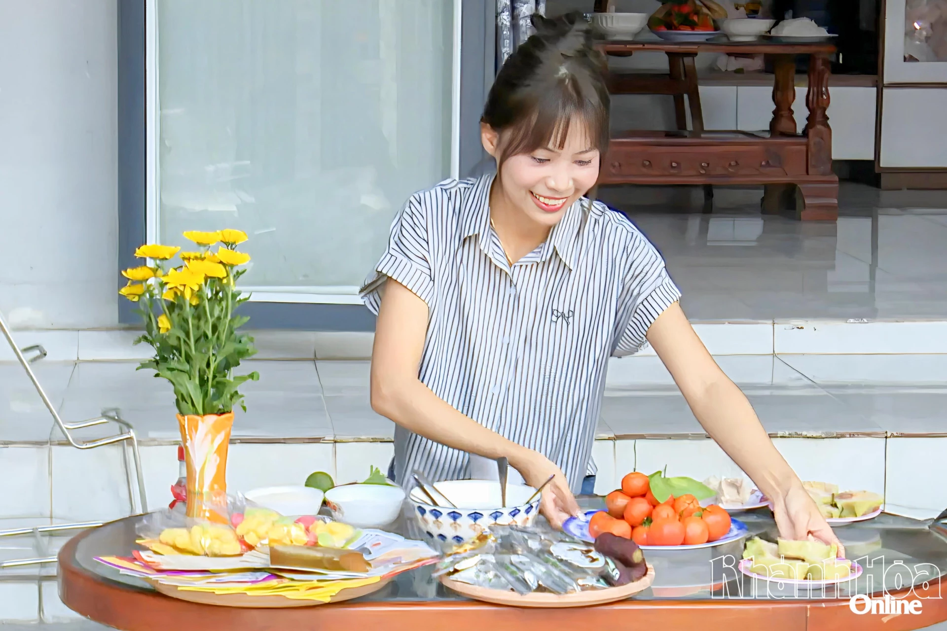 Chị Huỳnh Thị Kim Liên (người dân được hỗ trợ xây nhà tại xã Suối Hiệp) tất bật chuẩn bị mâm cúng tất niên trong căn nhà mới.