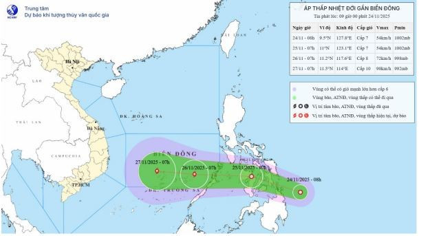 Bản đồ dự báo quỹ đạo và cường độ áp thấp nhiệt đới phát lúc 9 giờ sáng 24/11/2025. (Nguồn: Trung tâm Dự báo khí tượng thủy văn quốc gia)