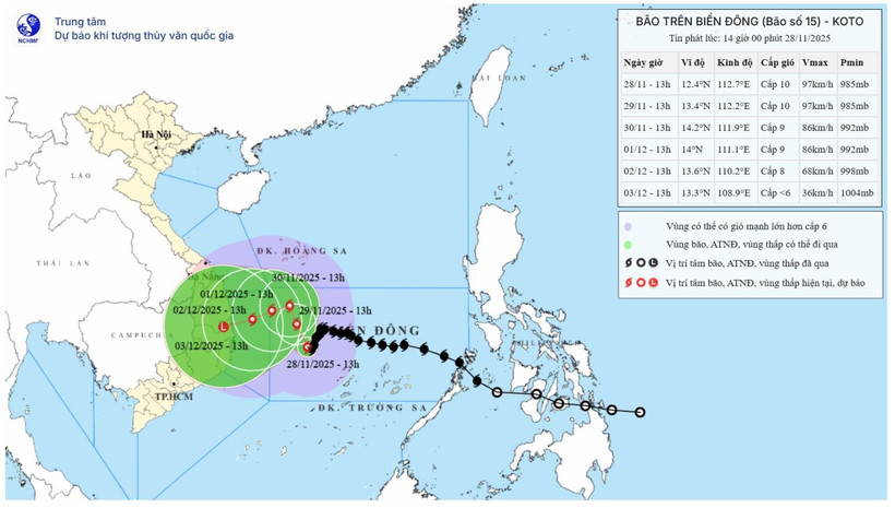 Đến 13 giờ chiều 29/11, áp thấp nhiệt đới di chuyển theo hướng đông bắc với tốc độ khoảng 15km/giờ, có khả năng đi vào vùng biển phía tây nam khu vực nam Biển Đông. Vị trí tâm bão ở vào khoảng 5,5 độ vĩ bắc; 106,5 độ kinh đông; trên vùng biển phía tây nam khu vực nam Biển Đông. Rủi ro thiên tai: Cấp 3 tại vùng biển phía tây nam khu vực nam Biển Đông.