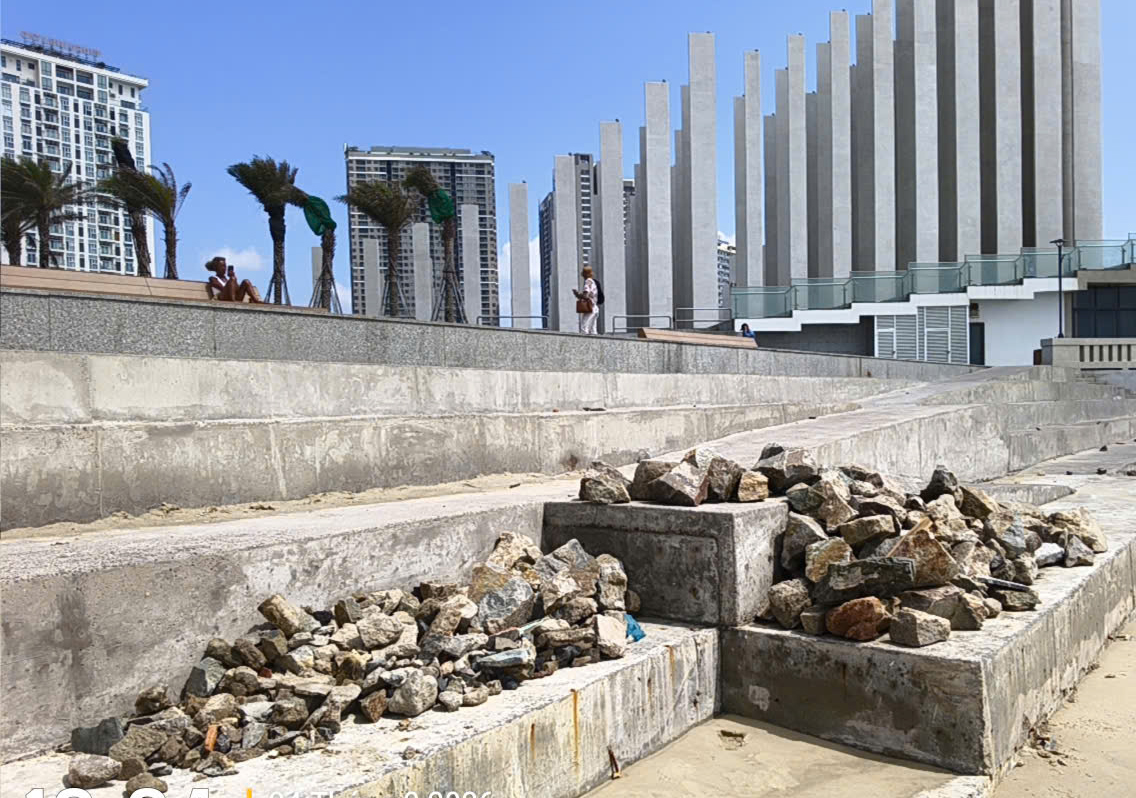 Ghi nhận trong sáng 24-3 tại khu vực bãi biển gần tháp Thắng Tam (phường Tam Thắng và phường Vũng Tàu, TPHCM), sóng lớn kết hợp thủy triều rút làm dạt lớp cát bề mặt, lộ diện hàng loạt khối đá hộc và mảng bê tông vỡ nằm dưới lòng bãi tắm. Đây được xác định là những vật tư, phế phẩm xây dựng cũ còn sót lại từ quá trình thi công hạ tầng trước đó, nay bị sóng biển "đào xới" lên, gây mất an toàn cho người dân và du khách.