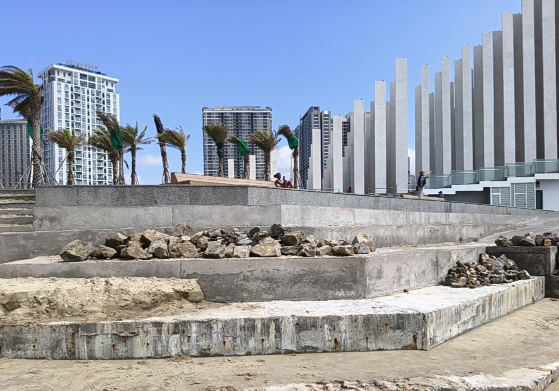 Tại khu vực bãi cát bằng phẳng - nơi du khách thường xuyên đi bộ, cũng lộ nhiều mảng bê tông cũ với bề mặt thô ráp, lởm chởm đá hộc tạo thành những vệt sắc nhọn.