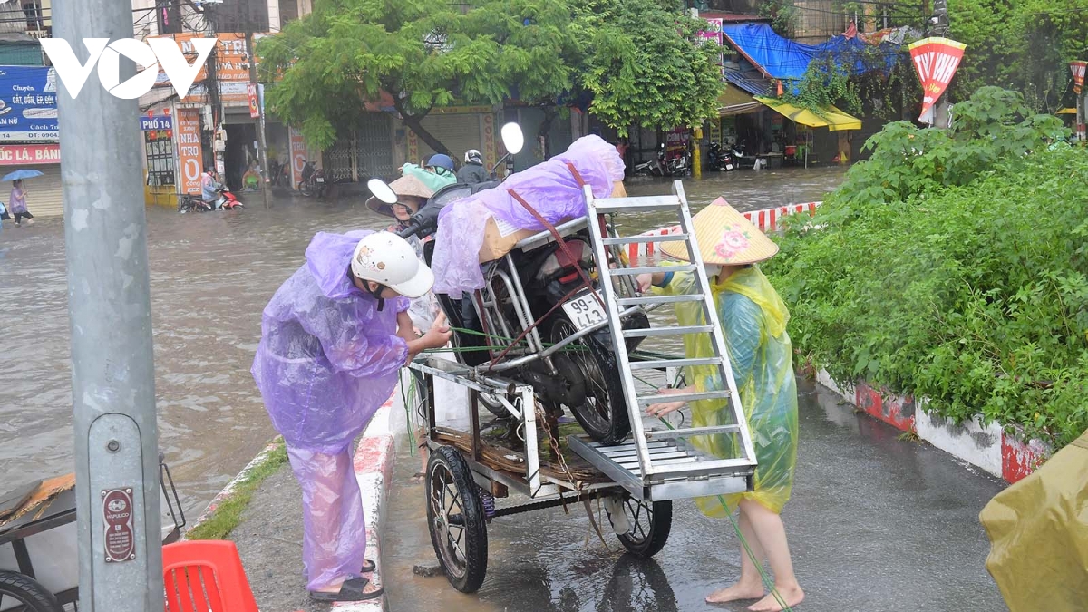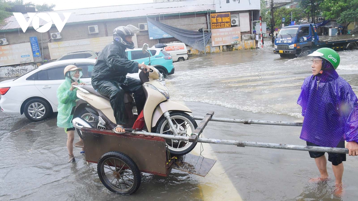 Tại nút giao Phạm Tu - Cầu Bươu - Xa La (Hà Nội) xảy ra ngập sâu, có đoạn ngập tới 1m và kéo dài gần 200m. Nhiều người dân quanh khu vực mang xe kéo tay ra chở người và phương tiện qua khu vực ngập sâu, thu nhập tiền triệu mỗi ngày.