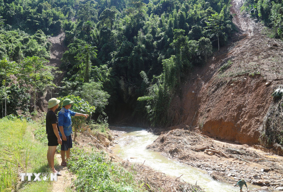 Vị trí có khả năng tạo thành đập dâng ngăn dòng tích nước nếu cung sạt lở đổ sập xuống suối Nậm Ngân. (Ảnh: Xuân Tiến/TTXVN)