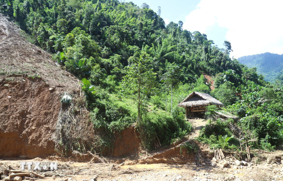 Phía dưới cung sạt lở có lều người dân dựng lên để ở và trông coi ruộng nương. (Ảnh: Xuân Tiến/TTXVN)