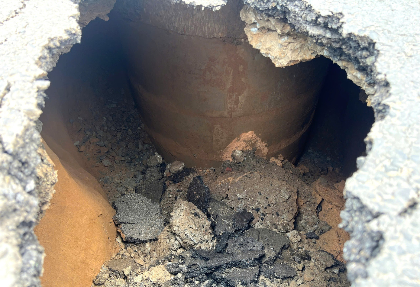 Nhìn vào bên trong hố giống như cái hang. Ngay sau khi phát hiện đường sụt lún thành hố, người dân sinh sống gần đó đã dùng vật cản, cảnh báo cho người tham gia giao thông tránh né.