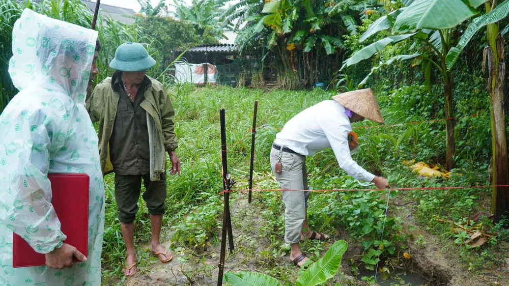 Cán bộ xã kiểm tra, cắm biển cảnh báo các hố sụt lún đối với người dân. Ảnh: CL.