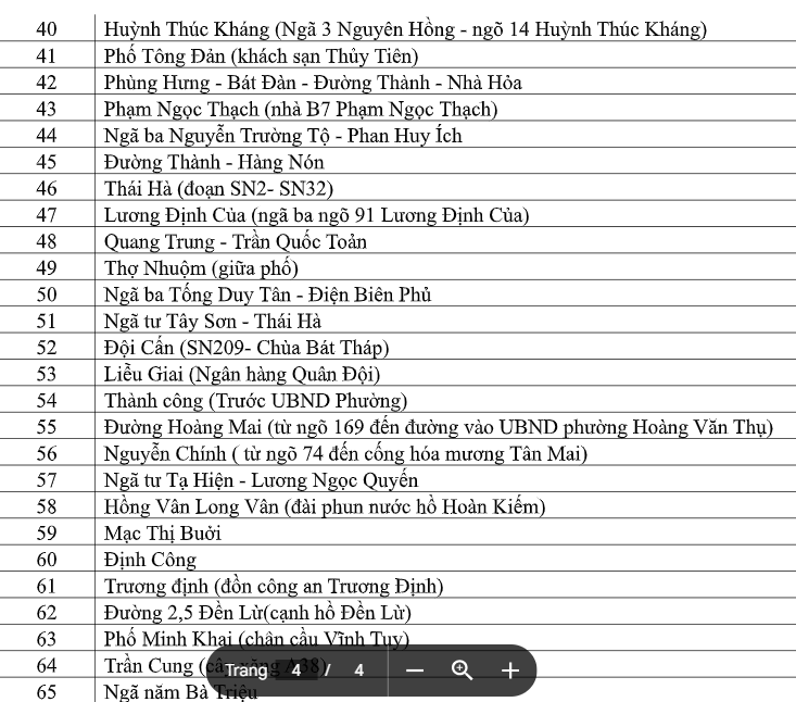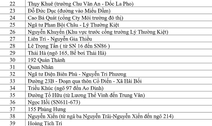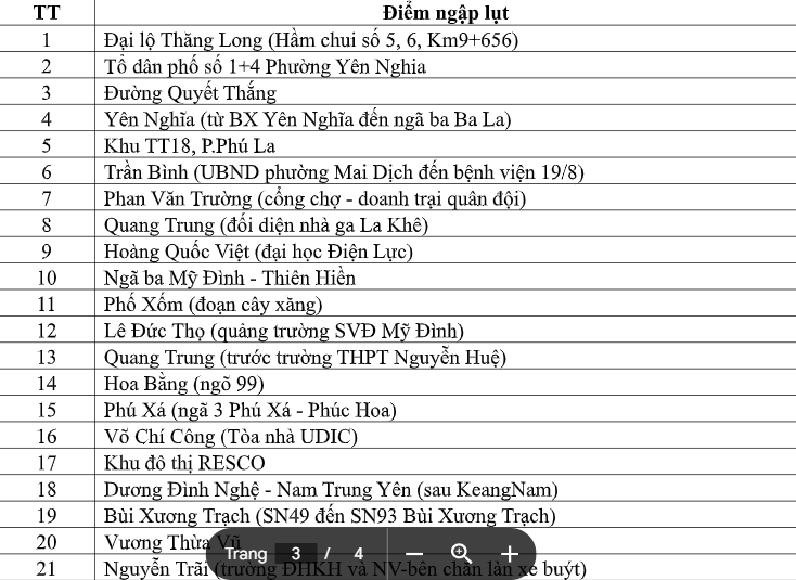 Danh sách các điểm ngập úng tại thành phố Hà Nội sau trận mưa lớn xảy ra ngày 30-9 vừa qua.