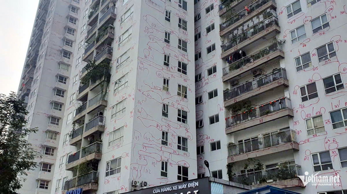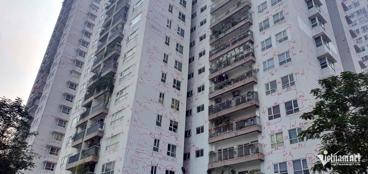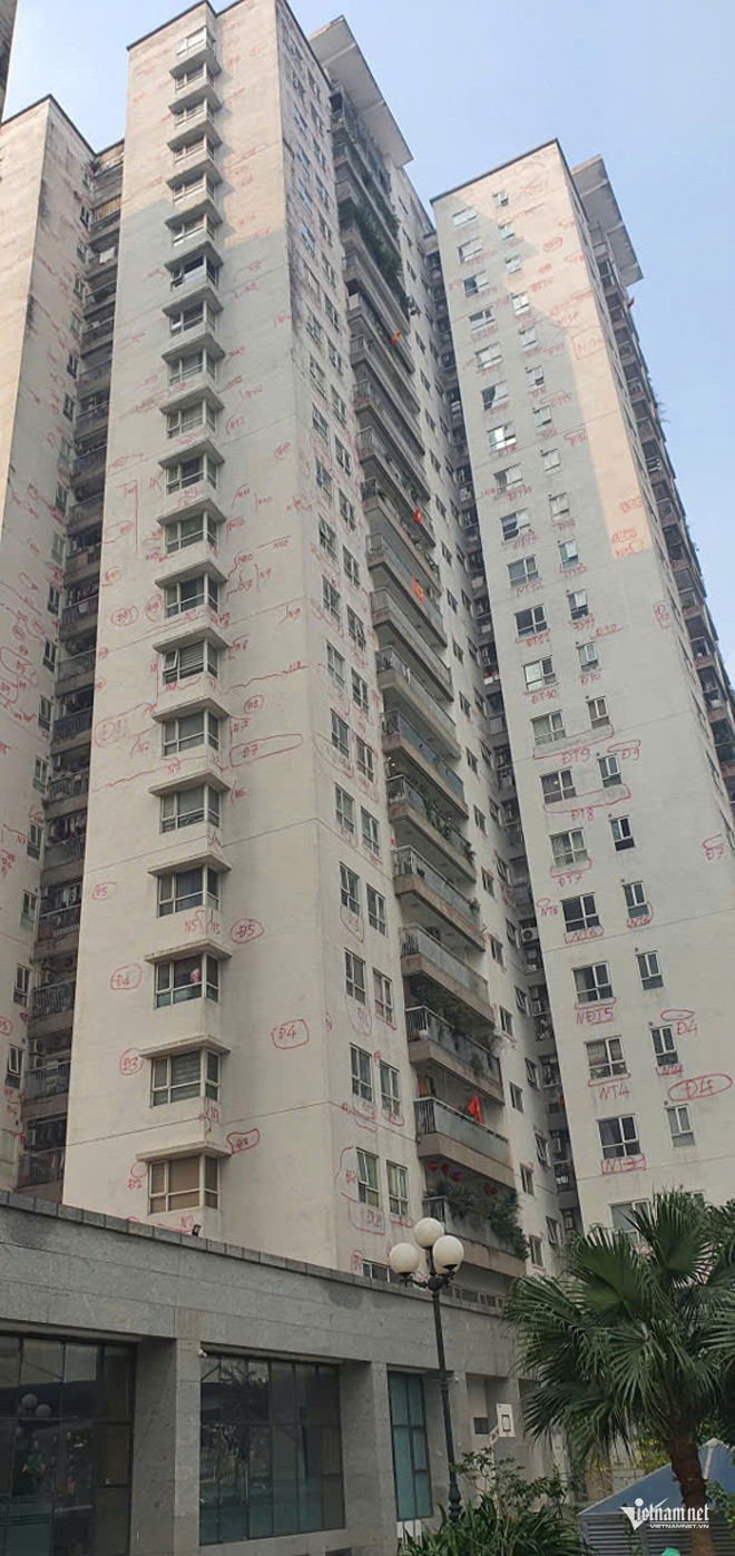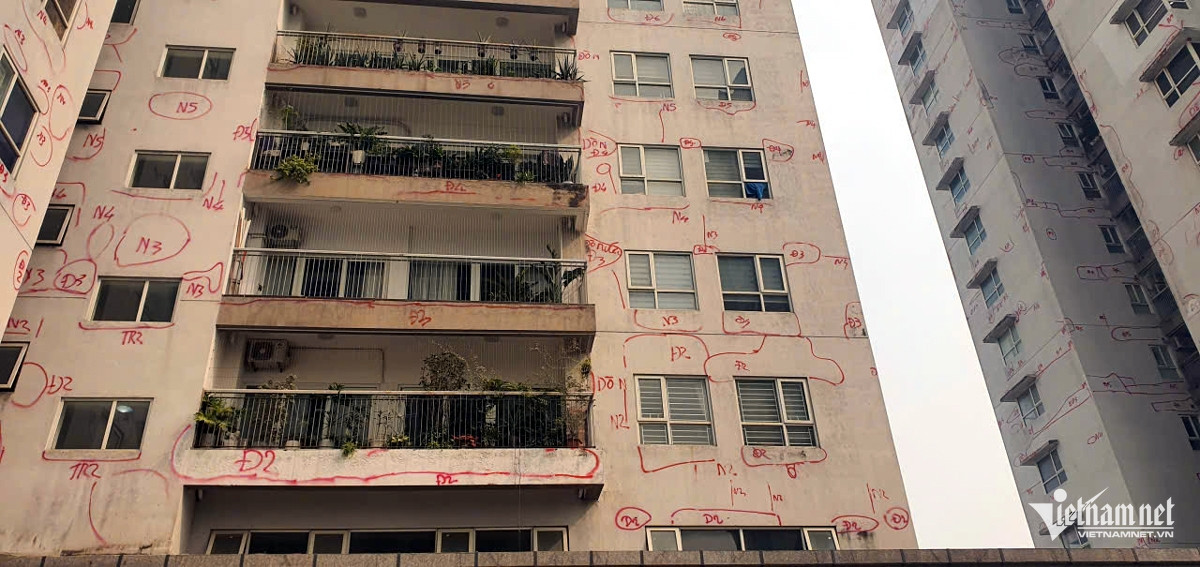 Trao đổi với phóng viên, anh L.V.T., cư dân tại đây, cho biết, thời gian gần đây ban quản lý tòa nhà đã thuê đơn vị chuyên môn đến khảo sát và đánh dấu các vị trí cần xử lý. “Chúng tôi thấy họ vẽ rất nhiều ký hiệu trên tường nhưng không hiểu rõ mục đích. Khi hỏi thì được giải thích là để phục vụ việc sơn, sửa chữa lại tòa nhà”, anh T. nói.