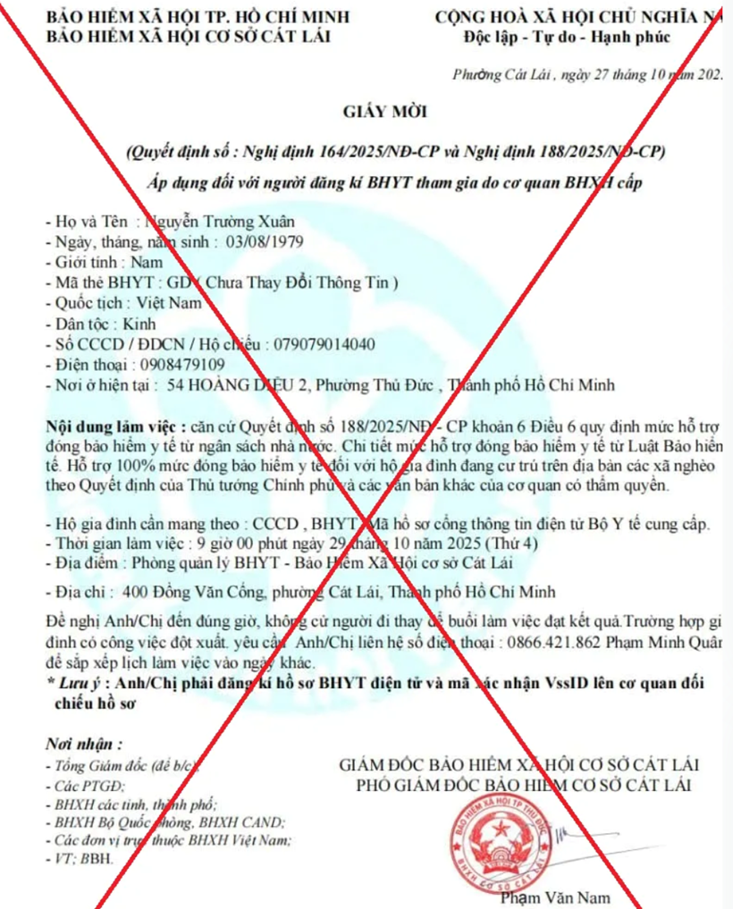 Từ vụ việc trên, BHXH TP HCM khẳng định, cơ quan BHXH TP HCM không phát hành bất kỳ loại giấy mời nào theo hình thức nêu trên; đồng thời, không yêu cầu người dân cung cấp thông tin cá nhân qua các số điện thoại.