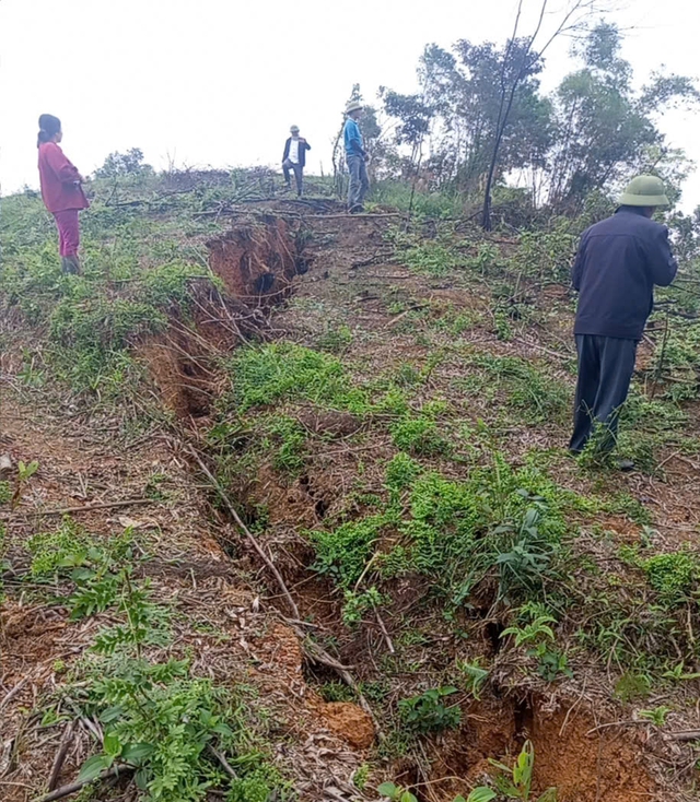 Trước đó, chiều 15/11, khi đang cào dọn đất sạt lở từ mái taluy dương tràn xuống tuyến đường trục xã ở thôn Quyết Thắng (xã Sơn Kim 2), người dân phát hiện trên núi bị sụt lún nghiêm trọng. Vết nứt kéo dài khoảng 150m, đất sụt tạo rãnh sâu từ 80cm - 1m, nhiều vị trí có thể sâu hơn.