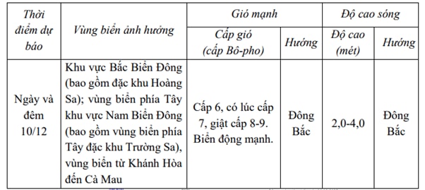 Ngày và đêm 11/12, khu vực Bắc Biển Đông (bao gồm đặc khu Hoàng Sa) có gió Đông Bắc mạnh cấp 6, giật cấp 7-8, sóng biển cao 2,0-4,0m, biển động; vùng biển từ Khánh Hòa đến Cà Mau và vùng biển phía Bắc khu vực Giữa Biển Đông có gió Đông Bắc mạnh cấp 5, có lúc cấp 6, giật cấp 7-8, sóng biển cao 2,0-3,0m, biển động.