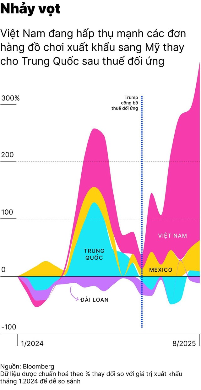Thị trường đồ chơi và dụng cụ thể thao tại Mỹ mùa mua sắm cuối năm 2025 đang chứng kiến sự thay đổi đáng kể về nguồn gốc xuất xứ hàng hóa. Các số liệu phân tích từ Bloomberg chỉ ra rằng hoạt động xuất khẩu nhóm hàng này của Việt Nam sang Mỹ đang trong giai đoạn tăng trưởng nhanh nhất kể từ năm 2023. Cụ thể, kim ngạch ghi nhận đà tăng tốc liên tục từ tháng 5, vượt mốc 500 triệu USD và nhanh chóng đạt trên 760 triệu USD vào tháng 8/2025. Mặc dù Trung Quốc vẫn giữ vị thế dẫn đầu về quy mô tuyệt đối với giá trị hàng tháng tính bằng tỷ USD, khoảng cách thị phần giữa hai quốc gia đang dần được thu hẹp.