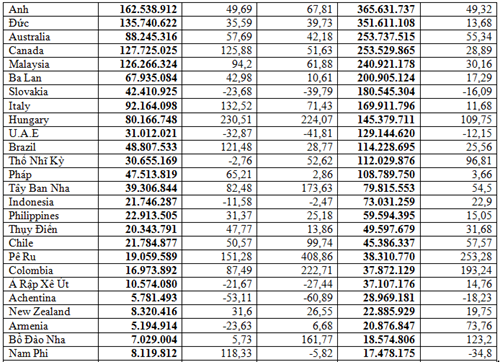 Hàn Quốc: Đạt 2,46 tỷ USD, tăng 23,87%, chiếm 8,01%.
