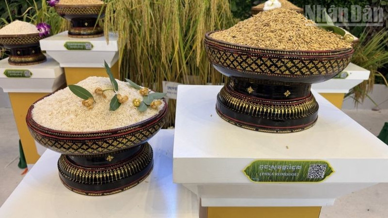 Gạo Phka Romdoul của Campuchia cùng gạo ST25 của Việt Nam giành giải nhất trong cuộc thi “Gạo ngon nhất thế giới” năm 2025 do The Rice Trader tổ chức, diễn ra từ ngày 7-9/11 tại Phnom Penh. Trong ảnh, thóc và gạo Phka Romdoul được giới thiệu tại CAFE25. (Ảnh: ĐINH TRƯỜNG)