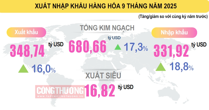 Theo số liệu sơ bộ, cán cân thương mại hàng hóa tháng 9/2025 xuất siêu 2,85 tỷ USD. Tính chung 9 tháng năm 2025, cán cân thương mại hàng hóa xuất siêu 16,82 tỷ USD (cùng kỳ năm trước xuất siêu 21,15 tỷ USD). Trong đó, khu vực kinh tế trong nước nhập siêu 20,26 tỷ USD; khu vực có vốn đầu tư nước ngoài (kể cả dầu thô) xuất siêu 37,08 tỷ USD.