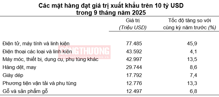 Trong 9 tháng năm 2025 có 32 mặt hàng đạt kim ngạch xuất khẩu trên 1 tỷ USD, chiếm 93,1% tổng kim ngạch xuất khẩu (có 7 mặt hàng xuất khẩu trên 10 tỷ USD, chiếm 67,9%).
