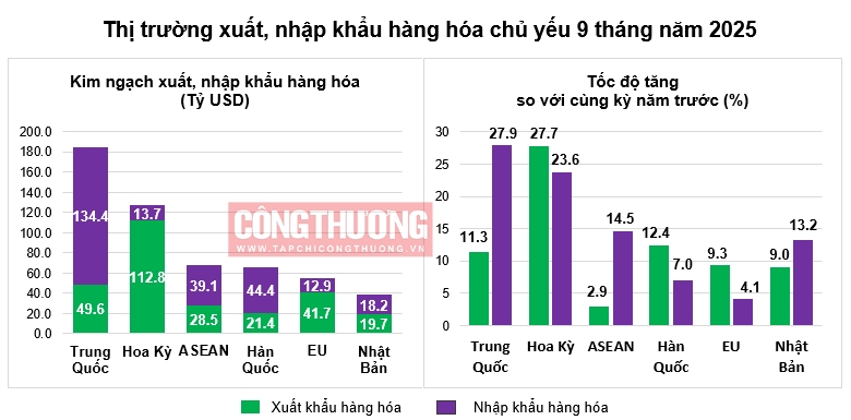 Về thị trường xuất, nhập khẩu hàng hóa 9 tháng năm 2025, Hoa Kỳ là thị trường xuất khẩu lớn nhất của Việt Nam với kim ngạch đạt 112,8 tỷ USD. Trung Quốc là thị trường nhập khẩu lớn nhất của Việt Nam với kim ngạch đạt 134,4 tỷ USD.