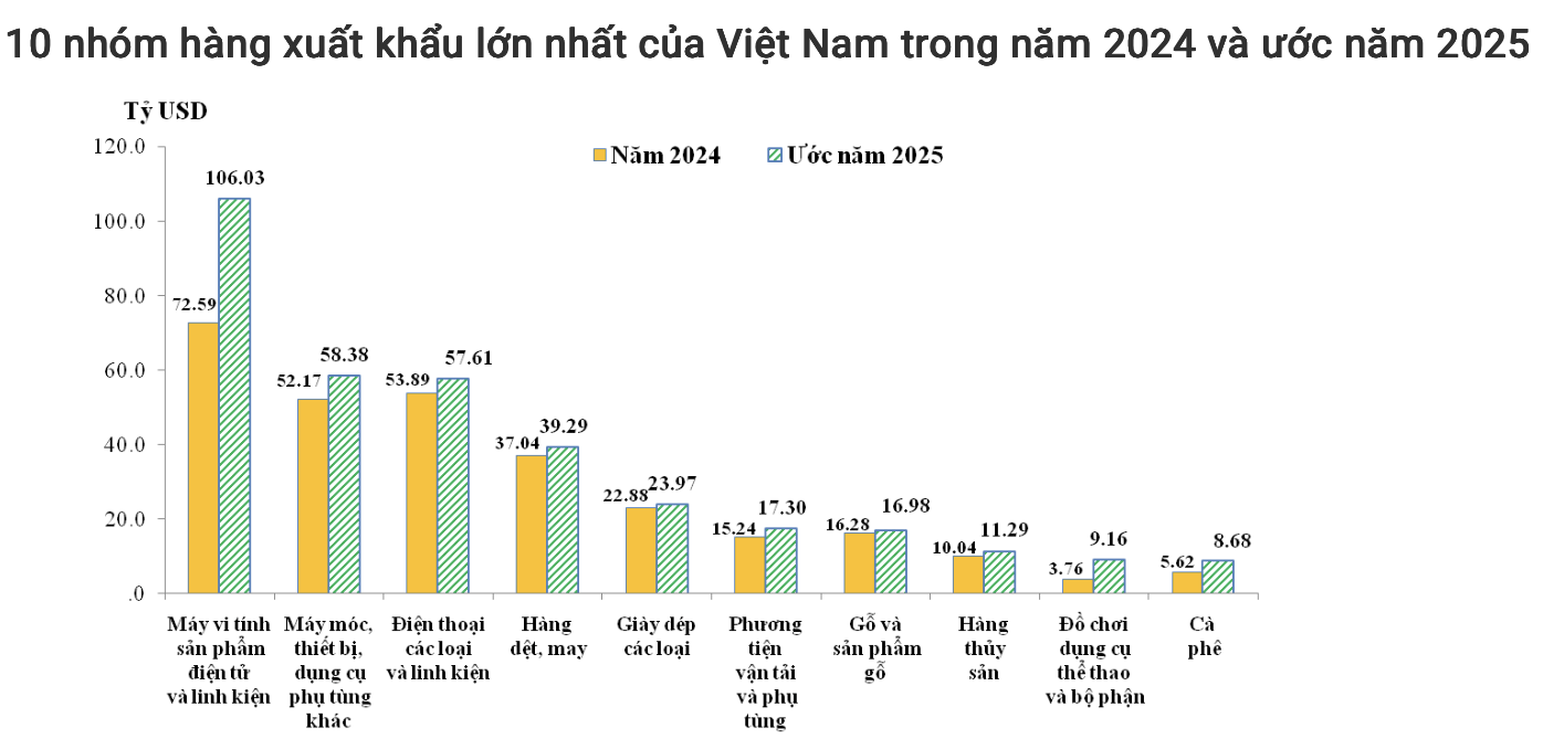 Số liệu thống kê sơ bộ cho thấy, năm 2025, cả nước ước tính có 36/45 nhóm hàng có giá trị xuất khẩu đạt trên 1 tỷ USD. Trong đó có 8 nhóm hàng đạt trị giá trên 10 tỷ USD, giá trị ước tính đạt 319 tỷ USD, chiếm 68% tổng kim ngạch xuất khẩu của cả nước.