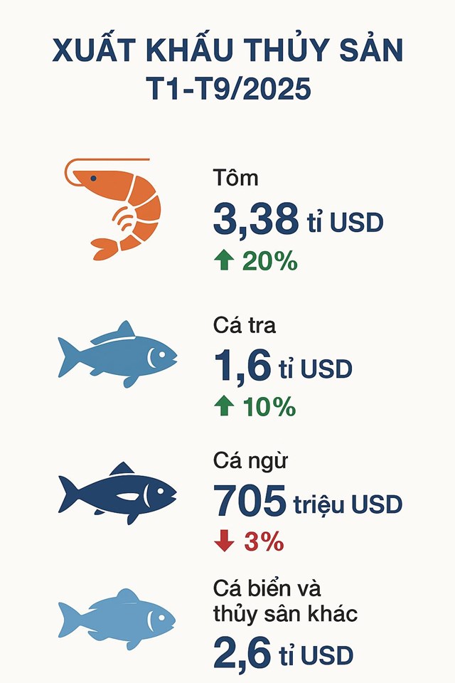 Theo Hiệp hội Chế biến và Xuất khẩu Thủy sản Việt Nam (VASEP), tháng 9/2025, kim ngạch xuất khẩu thủy sản đạt gần 991 triệu USD, tăng 7,5% so với cùng kỳ. Lũy kế 9 tháng đầu năm, xuất khẩu đạt 8,33 tỷ USD, tăng 15,5% so với năm trước.