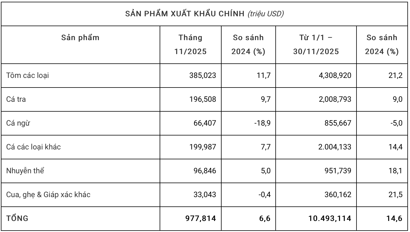 Theo Hiệp hội Chế biến và Xuất khẩu Thủy sản Việt Nam (Vasep), tháng 11/2025, xuất khẩu thủy sản Việt Nam đạt gần 990 triệu USD, tăng 6,6% so với cùng kỳ 2024.