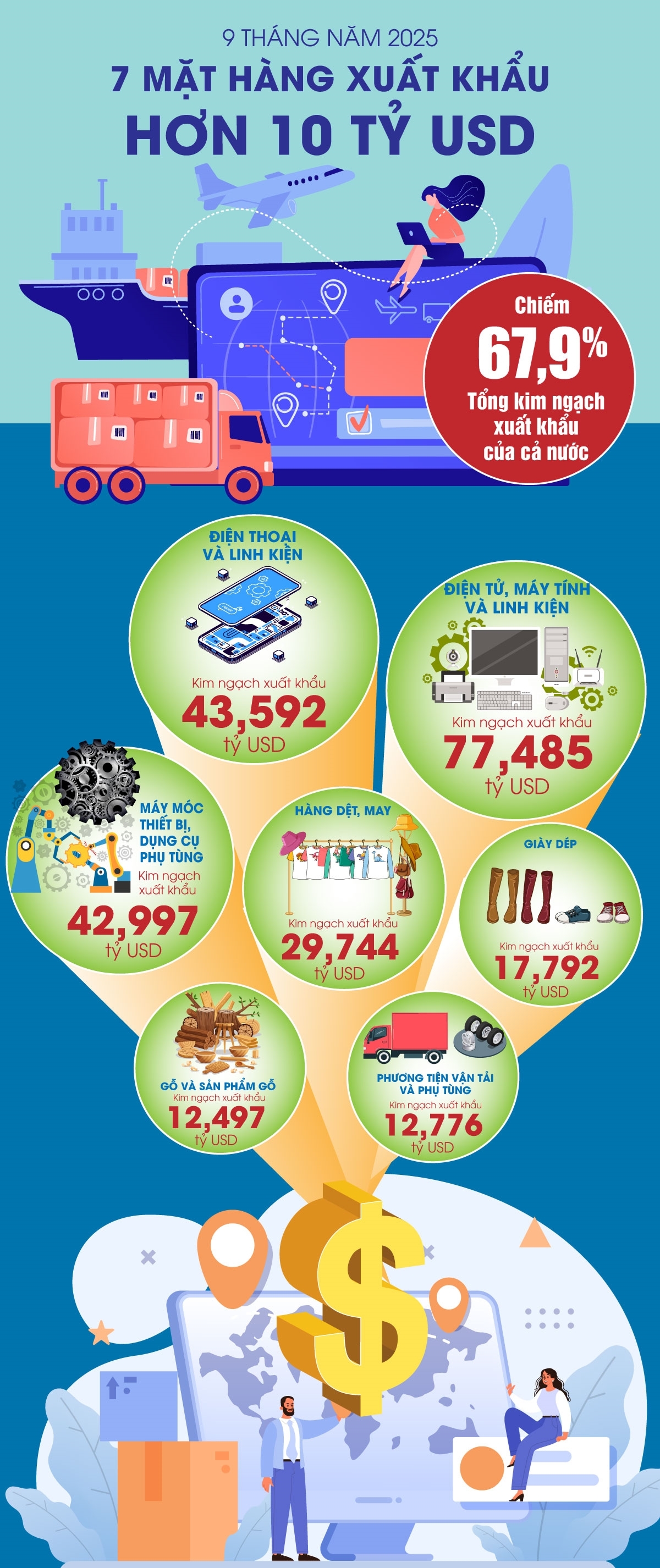 Theo số liệu từ Bộ Công Thương, trong số 32 mặt hàng đạt kim ngạch xuất khẩu trên 1 tỷ USD thì có 7 mặt hàng đạt trên 10 tỷ USD, thể hiện sự tăng trưởng bứt phá, khẳng định vai trò dẫn dắt và trụ cột trong hoạt động xuất khẩu của cả nước.