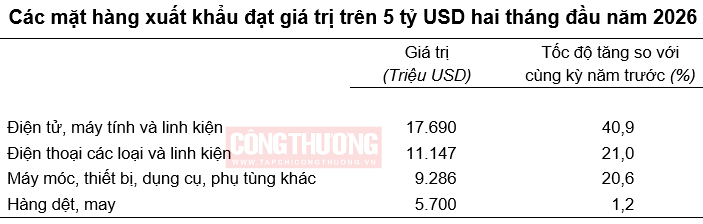 Trong hai tháng đầu năm 2026 có 13 mặt hàng đạt kim ngạch xuất khẩu trên 1 tỷ USD, chiếm 79,9% tổng kim ngạch xuất khẩu (có 4 mặt hàng xuất khẩu đạt trên 5 tỷ USD, chiếm 57,4% gồm: Điện tử, máy tính và linh kiện; Điện thoại các loại và linh kiện; Máy móc, thiết bị, dụng cụ, phụ tùng khác; Hàng dệt, may).