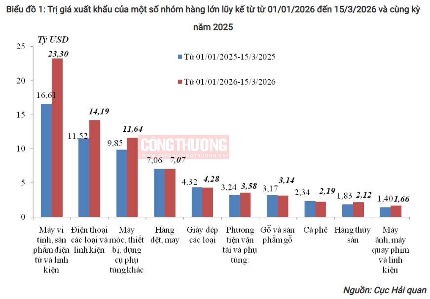 Trị giá xuất khẩu kỳ 1 tháng 3/2026 tăng so với kỳ 2 tháng 2/2026 ở các nhóm hàng sau: máy vi tính, sản phẩm điện tử và linh kiện tăng 2,52 tỷ USD, tương ứng tăng 81,9%; máy móc, thiết bị, dụng cụ và phụ tùng tăng 1,25 tỷ USD, tương ứng tăng 114,3%; hàng dệt may tăng 881 triệu USD, tương ứng tăng 182,2%; giày dép các loại tăng 412 triệu USD, tương ứng tăng 102,5%...