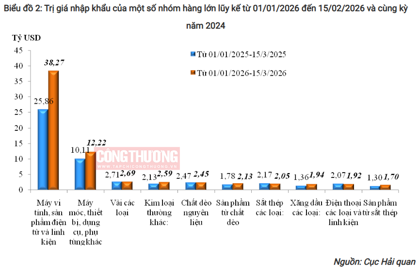 Như vậy, tính đến hết 15/3/2026, tổng trị giá nhập khẩu của cả nước đạt 100,32 tỷ USD, tăng 24,6% (tương ứng tăng 19,78 tỷ USD) so với cùng kỳ năm 2025.