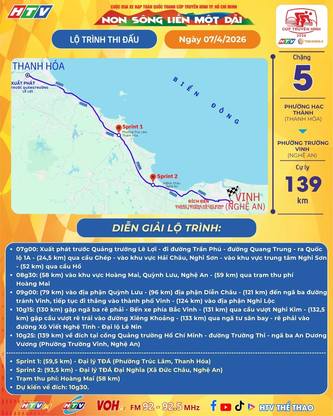 Các tay đua xuất phát chặng 5 từ phường Hạc Thành (Thanh Hóa) đi phường Trường Vinh (Nghệ An), dài 139km.