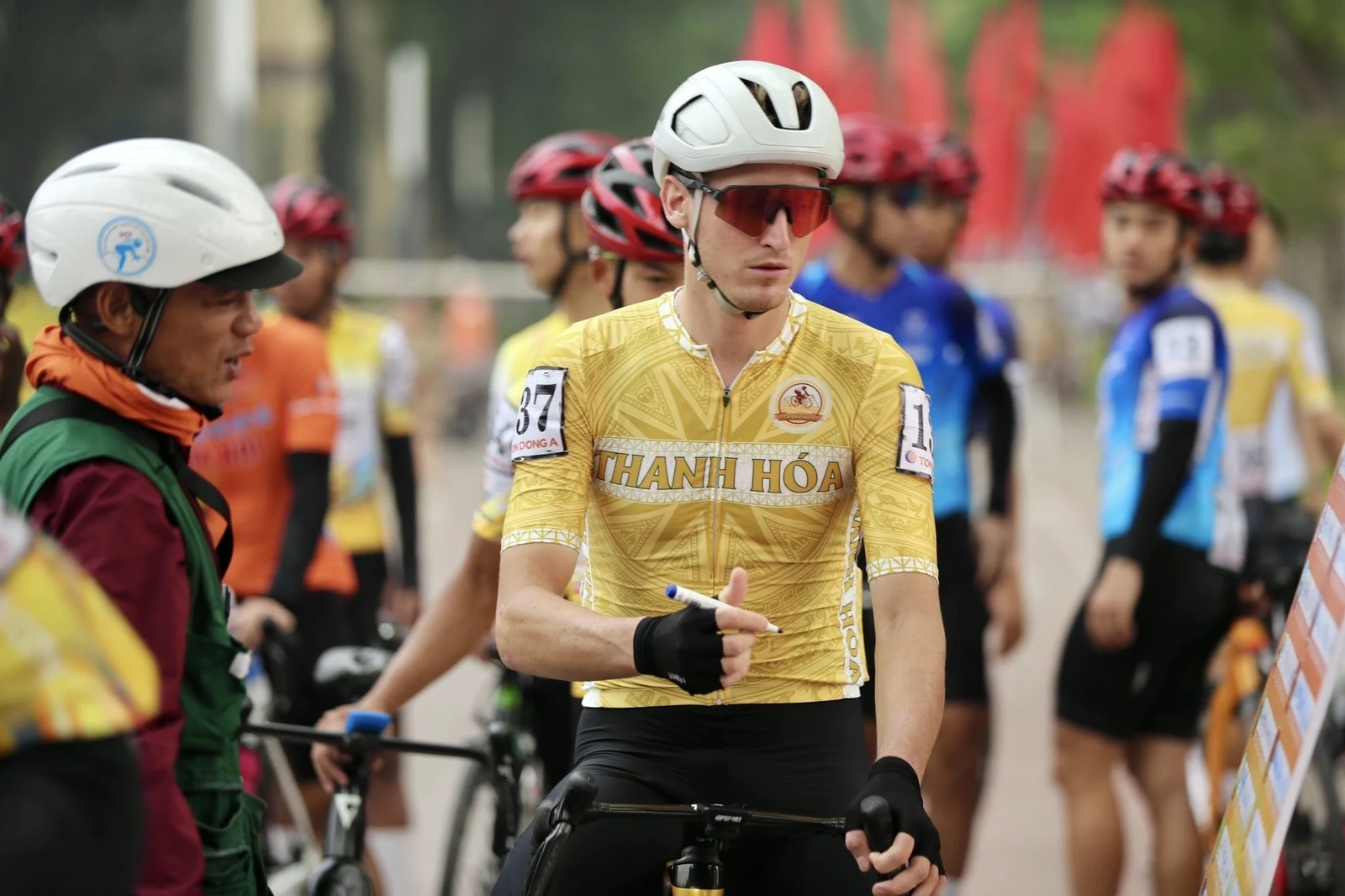 Giám đốc Sở Văn hóa, Thể thao và Du lịch Thanh Hóa Lê Văn Trung động viên, chụp ảnh lưu niệm cùng đội Xe đạp Thanh Hóa trước giờ xuất phát.