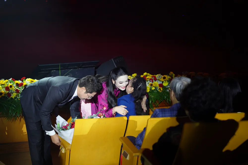 Trong khoảnh khắc nghẹn ngào ấy, vợ và con trai của cố GS.NSND Trung Kiên - NSND Trần Thu Hà và nhạc sĩ Quốc Trung - bước lên sân khấu, trao bó hoa tri ân và ôm cảm ơn từng nghệ sĩ tham gia chương trình.