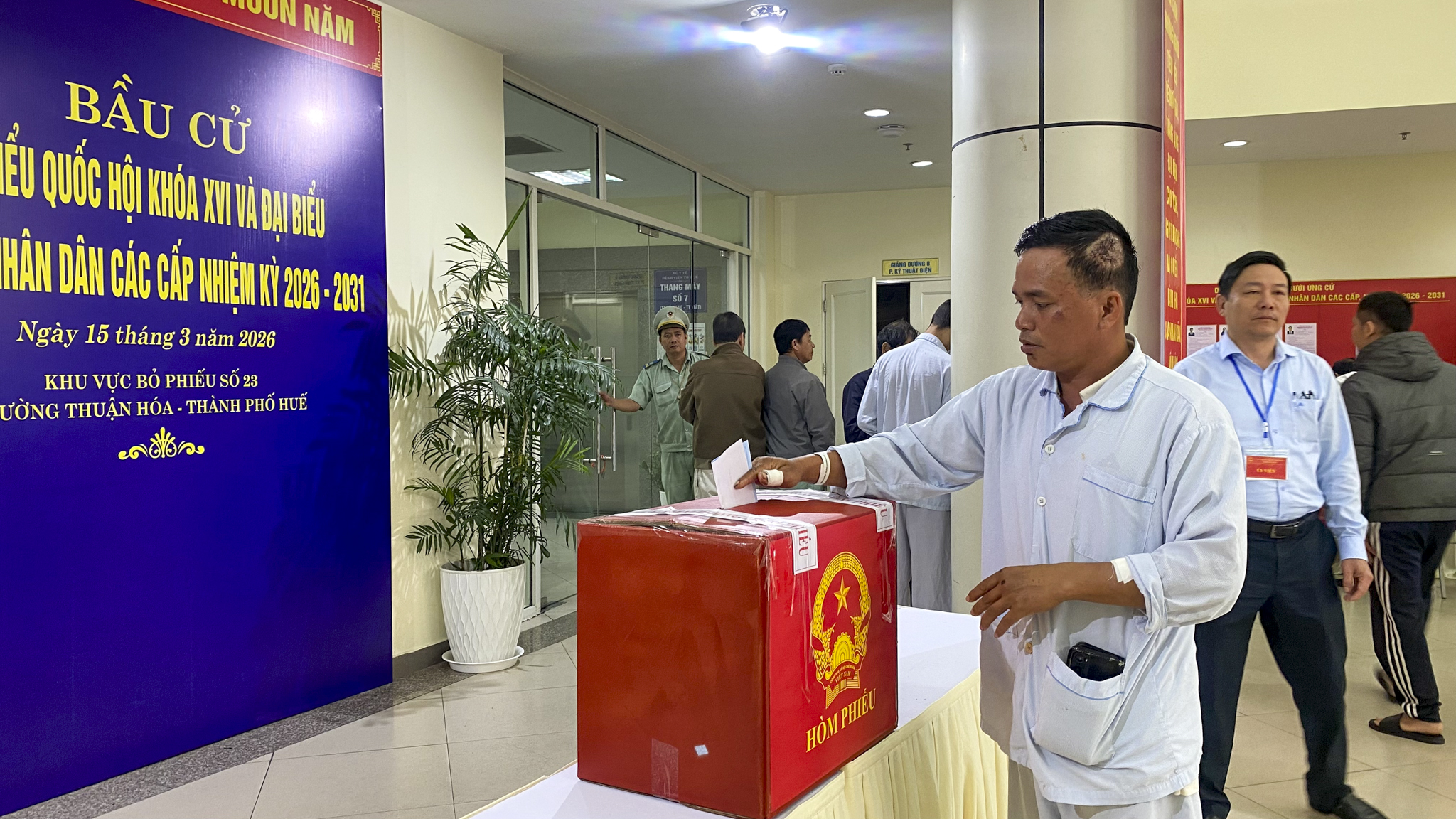 Ông Phạm Văn Tuyến (84 tuổi, ngụ tại phường Phú Bài, TP Huế) bày tỏ niềm tự hào, phấn khởi khi được tự tay bỏ lá phiếu bầu các đại biểu ngay tại nơi đang điều trị là Bệnh viện Trung ương Huế.