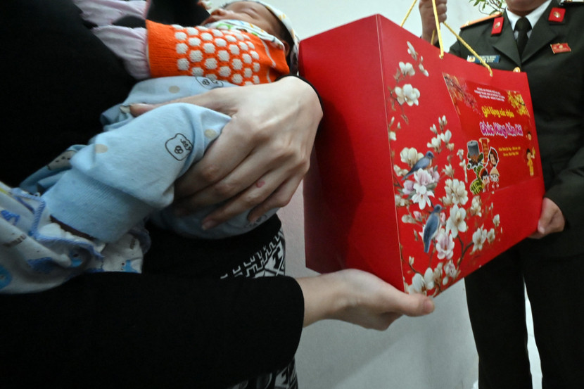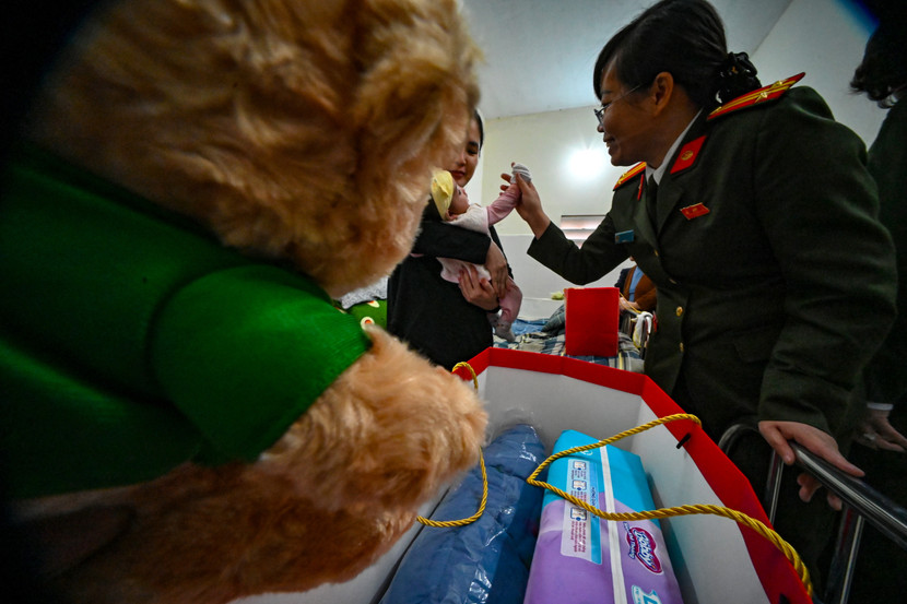 Những túi quà Tết đỏ thắm chứa đựng bỉm, sữa, quần áo ấm, mừng tuổi năm mới... được trao tận tay các cặp mẹ con. Trong đợt này, đoàn đã tặng quà cho 9 cháu tại Trại Tạm giam số 1 và 3 cháu tại Trại Tạm giam số 2.